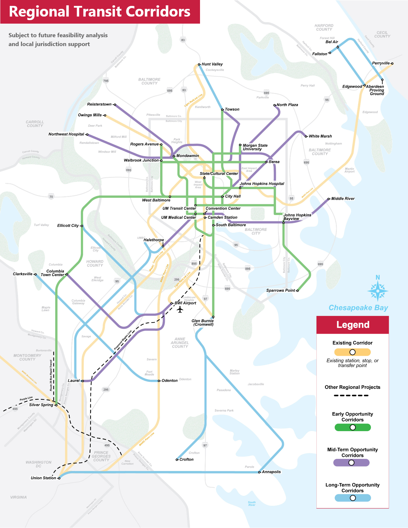 Corridor Studies identify the range of options (also known as alternatives) that best serve existing and future transit demand for a specific study area. In each case, MDOT MTA and its partners will work with jurisdictional partners and the public to set corridor-specific goals and objectives to evaluate potential routes, modes, and service characteristics (stop/station locations and frequency).
